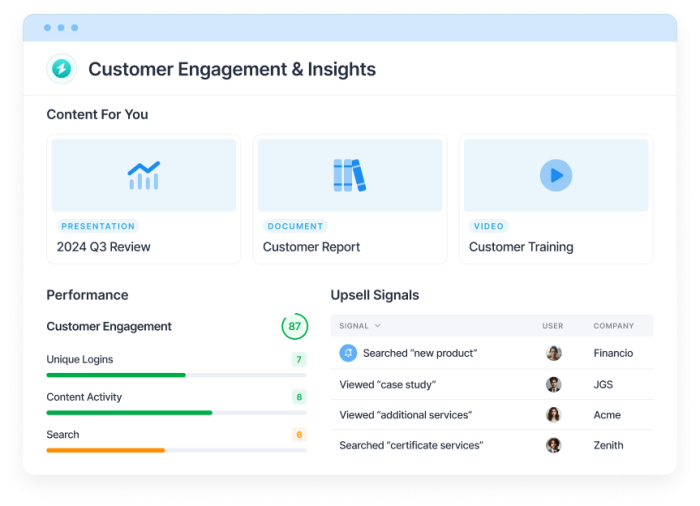 Customer engagement platform designed for go-to-market teams. It helps deliver the most relevant sales, educational, training, and knowledge base content all in one place that’s easy to use and navigate, without added overhead, steep learning curves, or compliance risks. Our solution combines powerful content management, actionable analytics and integrates with your current tech stack.