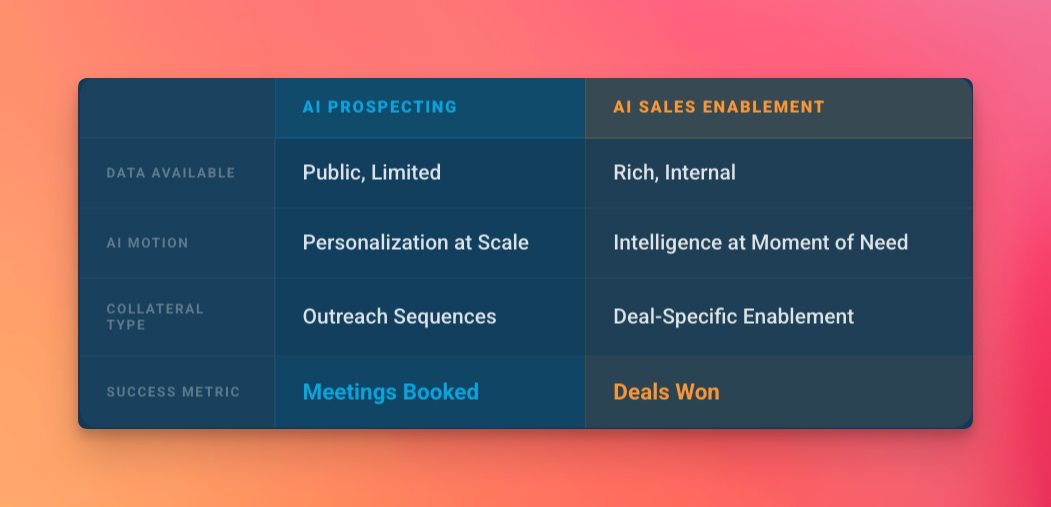AI prospecting works with limited public data. AI sales enablement works with rich internal data — call recordings, content libraries, competitive intelligence.