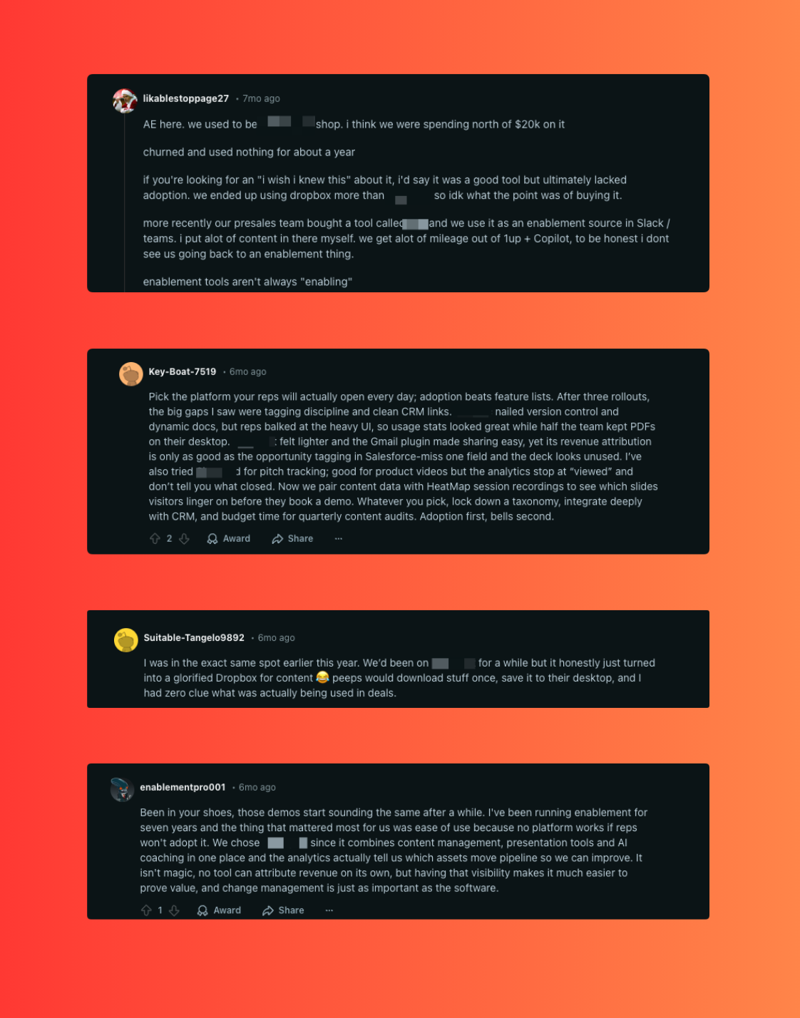 Sales enablement investments are limited to quota carrying account executives and account managers. However, product managers and other stakeholders are not onboarded on these platforms.