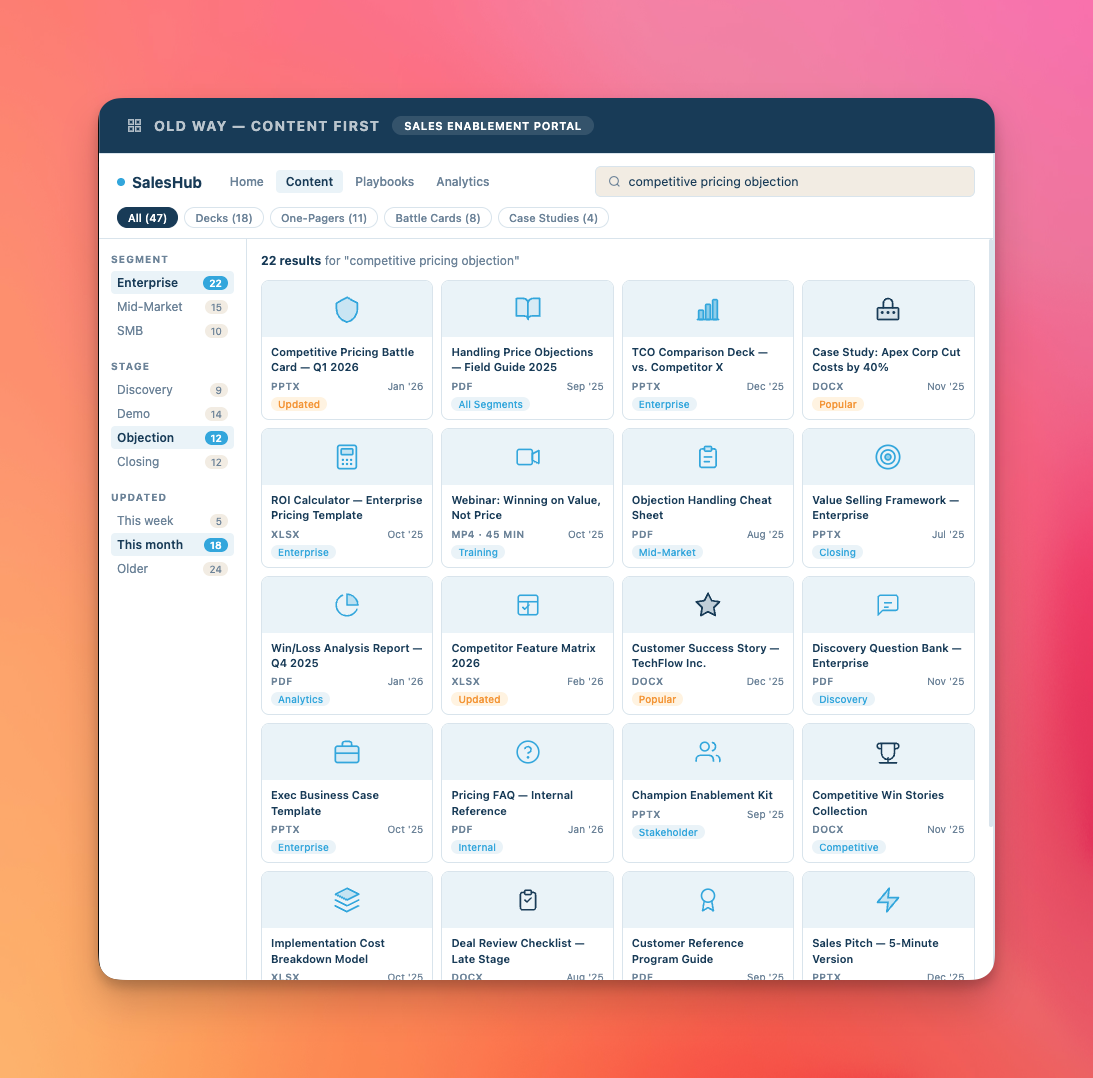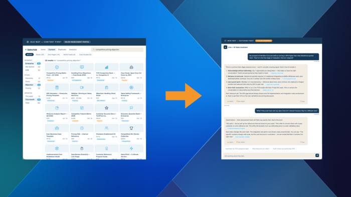 Sales Enablement applications were much better content library systems than Google Drive and SharePoint. But the output was a list of content assets. Whether a rep accessed these systems from the web, or from inside CRM, or in Slack or Teams, the output was always a list of content assets that matched the rep’s search criteria.