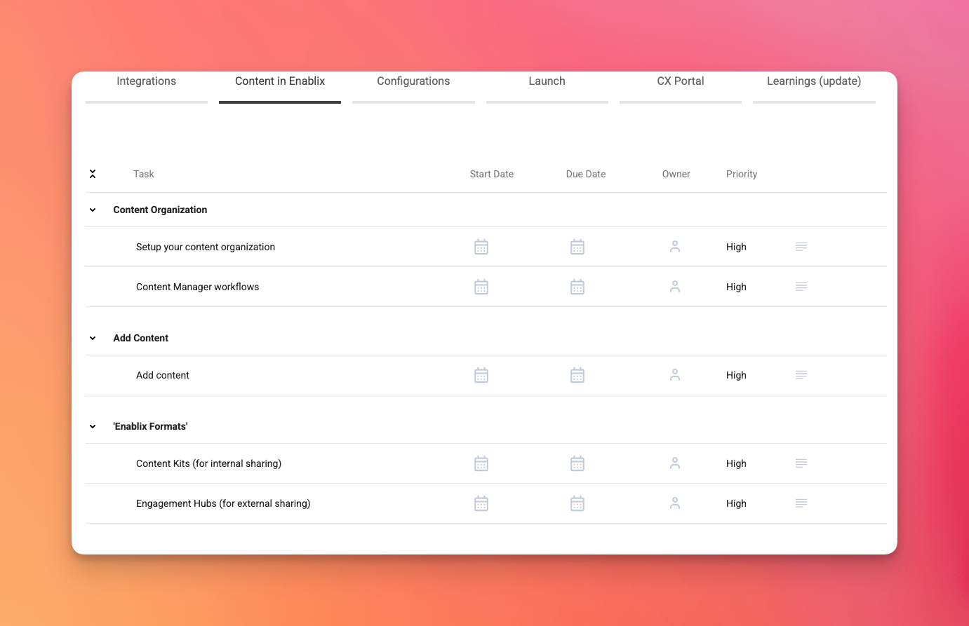 And Sales Enablement solution providers, like Enablix, HighSpot, and Seismic, based their strategy on content. They all supported robust content management capabilities and allowed sales enablement managers and marketers to maintain a library of approved content and resources to get the job done. Here is a snapshot of Enablix’s launch plan that speaks to the importance of content in the Sales Enablement platform setup process.