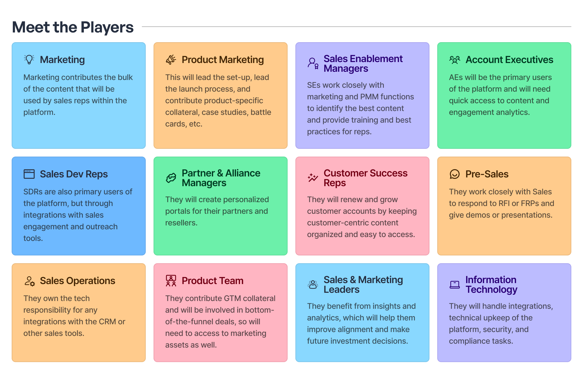 In our recent Revenue Enablement Platform Implementation Guide, we broke down the 12 teams that can potentially be involved in a revenue enablement program:
