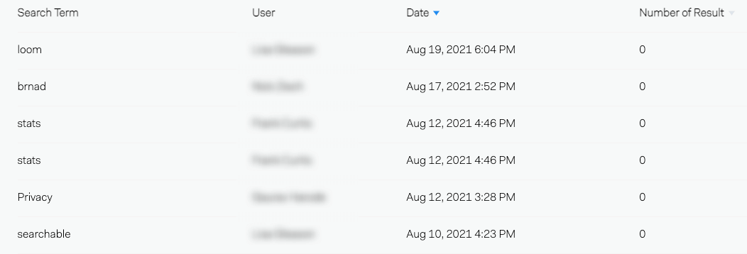 You can see in this example that our reps are looking for analytics, integrations with loom, and sample buyer questions… but there’s a problem. Our user that searched for ‘loom’ wasn’t able to find any results. Is this a common issue? Let’s specifically search for terms that get 0 results: