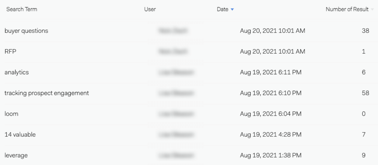 Many of our users’ favorite feature is the ability to see what their sales teams are looking for – this influences their marketing roadmap and helps them understand what’s working and not working. As an example, let’s take a look at a foundational insight: all of the recent searches in the platform: